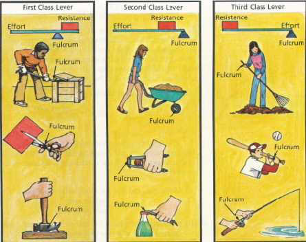There are three general types of levers. With a first class lever, the fulcrum is always between the two forces. A first class lever changes the direction of a force. An example of a first class lever is a crowbar. For a second class lever, the fulcrum is at the end of the lever, the resistance force is near the center, and the effort force is applied to the other end. A wheelbarrow is an example of a second class lever. Unlike the first class lever, the direction of the force is not changed. See figure 5-11, page 207. In a third class lever the fulcrum is always at one end, the resistance force is at the other end, and the effort force is applied in between the fulcrum and the resistance force. A rake is an example of a third class lever. Your hand at the end of the rake is the fulcrum. The leaves of the rake which scrape the ground is the resistance force. Your other hand in the middle of the rake handle applies the effort force. All third class levers are used to increase the distance moved, not to decrease the force applied.